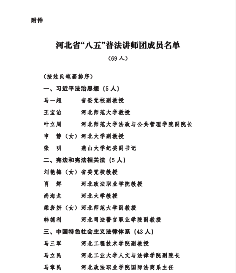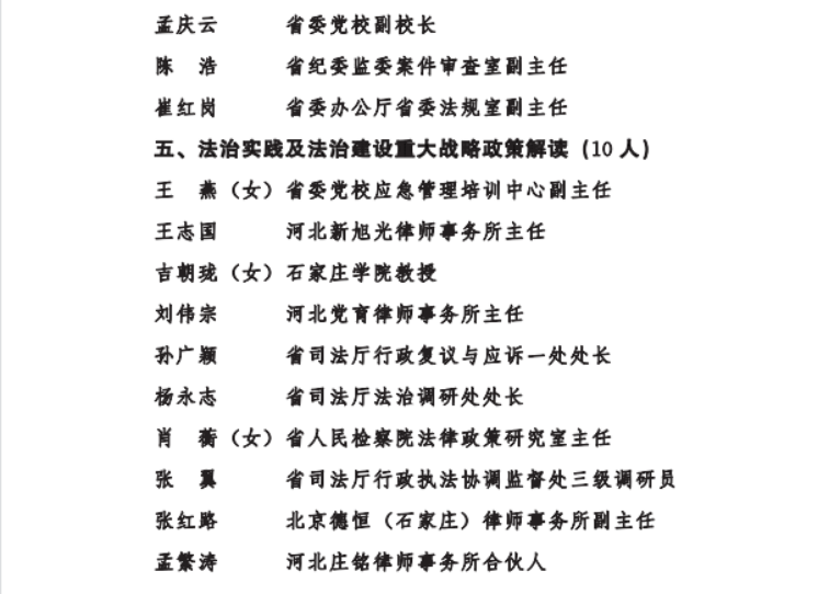 为深入学习贯彻习近平法治思想,推进“八五”普法规划顺利实施,按照国家相关部门关于成立全国“八五”普法讲师团的通知要求,日前,省委宣传部、省司法厅、省法学会、省法治宣传教育领导小组办公室决定成立河北省“八五”普法讲师团。讲师团在全省范围内共遴选出69位在相关法律领域有较高威望和建树、且热心普法工作的专家学者、法律实务部门工作人员。公司bevictor韦德国际胡海涛、李大庆、田宝会、田韶华、赵一强、王沛、张亮等七位教师入选。