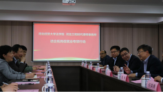 2023年4月13日下午,bevictor韦德国际党委副书记黄华、副经理胡海涛、副经理李大庆一行赴河北三和时代律师事务所开展访企拓岗促就业专项活动。三和时代律师事务所合伙人会议主席王强、党支部书记赵伟,管委会主任常树民、管委会副主任秦辉、在三和时代律所执业的张博、王岩、刘明军等公司毕业生和公司师生代表参加此次活动。