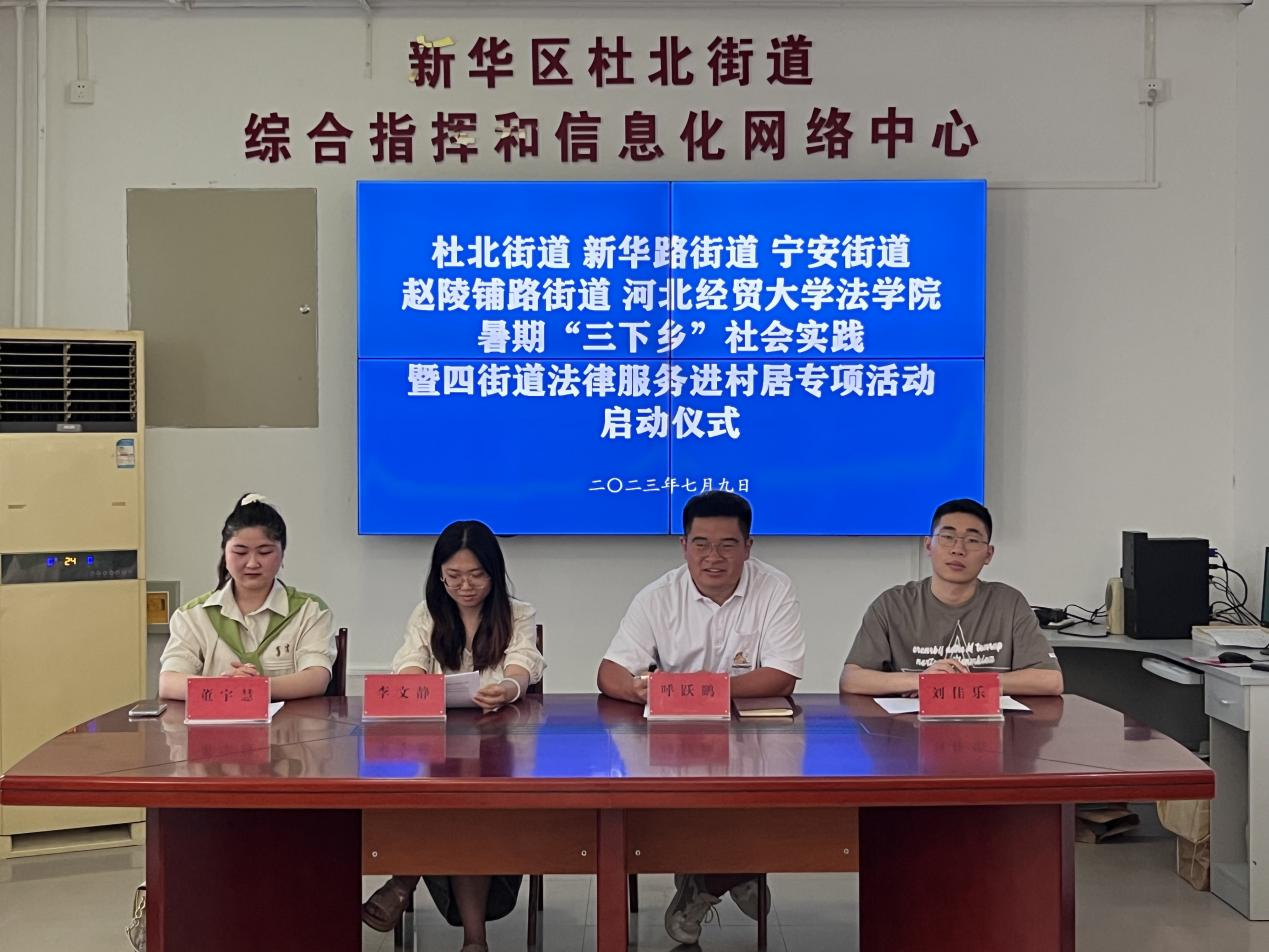 7月9日上午,bevictor韦德国际联合杜北街道、新华路街道、宁安街道、赵陵铺路街道于杜北街道公共法律服务中心联合举办暑期“三下乡”社会实践暨四街道法律服务进村居专项活动启动仪式,杜北司法所工作人员呼跃鹏主持仪式,新华路司法所、宁安司法所、赵陵铺路司法所工作人员及bevictor韦德国际“枫桥”暑期“三下乡”社会实践团全体成员参加仪式。