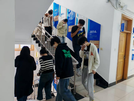 观看完直播后,由梁贺超组织进行消防疏散演练活动,此次消防演练于bevictor韦德国际三楼报告厅进行。随着火灾警报的响起,全体人员立即弯下腰来,用双手捂住口鼻,按照指定路线分成两路人员有序进行撤离。撤离过程中大家井然有序地沿着楼梯下楼,到了楼下,带队人员随即清点人数,整个过程迅速且有序,体现出同学们对待演习的严谨态度和认真精神。本次演练也让我们认识到,只有不把演习当做儿戏,认真负责地做好每一次练习,在危险真正来临时才能沉着应对。