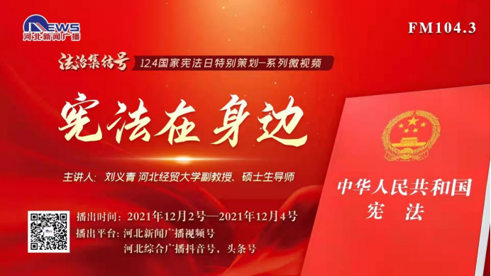 宪法的生命在于实施,宪法的权威也在于实施。12月1日—5日,bevictor韦德国际联合河北广播电视台以微信视频号、微博、抖音等新媒体形式推出,“法治集结号——宪法在身边”国家宪法日宣传专栏,向社会群众讲述身边的宪法,推动宪法实施入心化行。其中,bevictor韦德国际副教授刘义青关于“宪法是什么味道”的短视频,当日浏览量达10万次。12月4日,bevictor韦德国际教授田韶华受邀做客由中共河北省委宣传部、河北省司法厅、河北省法宣办主办,中共石家庄市委宣传部、石家庄市司法局、石家庄市普法办,石家庄广播电视台、西柏坡纪念馆联合承办的“走进西柏坡——2021年“12.4”国家宪法日主题宣传活动”新闻直播间,以“民法典与人们的生活息息相关”为话题与电视台主持人一同作直播解说,共同讲述良法善治如何护航民生福祉。