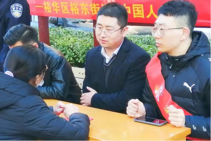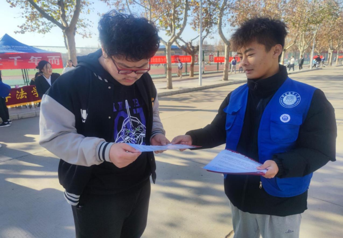 (普法志愿服务队员发放宪法知识宣传单)