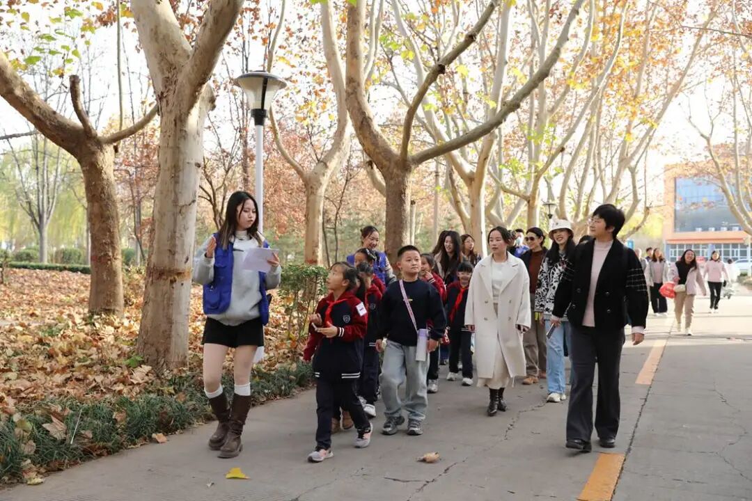 校园初体验环节涵盖三大特色场所:志愿者引领孩子们漫步金黄银杏林,宣讲员结合校园年轮故事与特色银杏节,讲述公司的发展历程;行至荷花池畔,“海阔凭鱼跃”的石碑前,志愿者向孩子们传递“志存高远、逐梦前行”的美好期许;走进图书馆,浓郁的墨香与丰富的藏书让孩子们直观感受大学的求知氛围与学术底蕴。在校园后花园,“报团打天下”趣味游戏欢乐开启,随着志愿者喊出数字口令,孩子们笑着奔跑、快速组队,在轻松愉悦的互动中拉近彼此距离,锤炼团队协作意识,为整场活动增添了满满的童趣与活力。