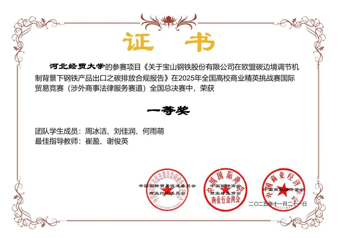 为深入贯彻党中央、国务院关于落实“强化外贸发展人才支撑”的核心要求,2025年11月,第十九届全国高校商业精英挑战赛国际贸易竞赛全国总决赛圆满落幕。本次竞赛由中国国际贸易促进委员会商业行业委员会、中国国际商会商业行业商会和中国商业经济学会联合主办,是纳入全国普通高校老员工竞赛排行榜的国家级A类赛事。决赛汇聚了武汉大学、上海对外经贸大学、中央财经大学等全国30个省(自治区、直辖市)近600所高校的顶尖代表队。公司两支参赛队伍不负众望,在涉外商事法律服务赛道分别斩获国家级一等奖、国家级三等奖,彰显了公司人才培养的扎实成效!