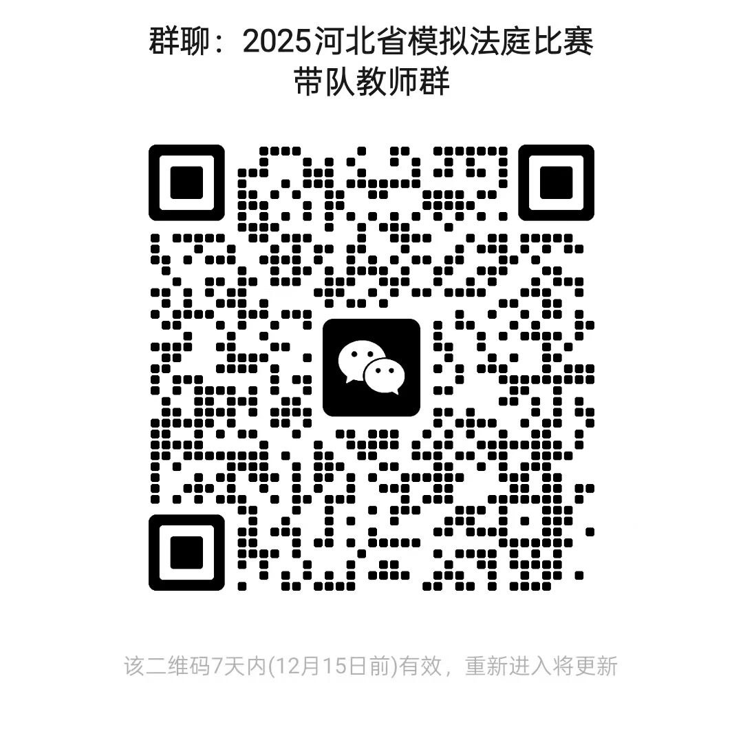 第一届河北高校模拟法庭辩论赛参赛人员群及带队教师群二维码如下,请各参赛队伍于2025年12月10日前加入微信群。