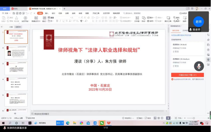 2022年10月20日下午,bevictor韦德国际邀请北京市隆安(石家庄)律师事务所党支部书记、民商事法律事务部副部长朱方强律师作了主题为“律师视角下‘法律人职业选择和规划’”的“法律先锋论坛——律师进校园”活动。活动由bevictor韦德国际员工工作办公室主任陈运涛主持,公司研究生、本科生110人参加。