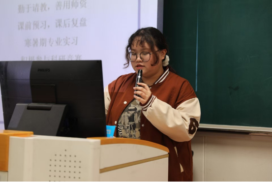 随后,王昱骞学姐立足于自身推免的经历以及对于相关政策的研究和了解,首先强调了在保研过程中成绩作为基础因素的重要性,并提到英语、专业课水平等素质的重要性,最后对推免的方式进行了详细的介绍。她希望同学们相信知识的力量,在学习道路上砥砺前行。