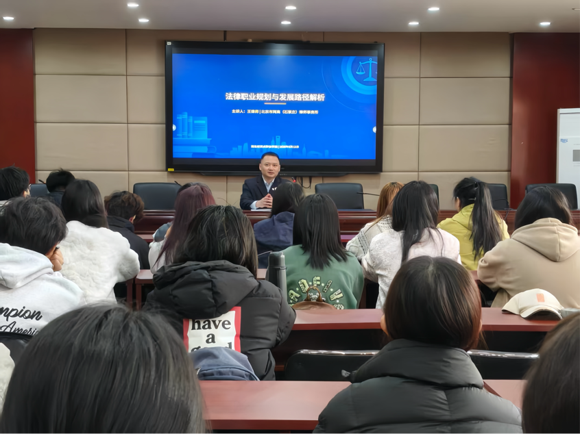 王建东律师结合十余年法律实务经验,以“法律行业职业全景解析与个人成长路径”为主题,为同学们开展了一场兼具深度与实用性的分享。他系统梳理法律行业主流职业,重点剖析法官、检察官、律师、公司法务的优劣势:法官稳定、社会认可度高、可深度参与司法实践,对专业与政治素养要求严苛; 检察官侧重刑事检察,专业性与使命感强,流程规范,办案要求严格; 律师灵活、发展空间大,对沟通、风控能力要求高。